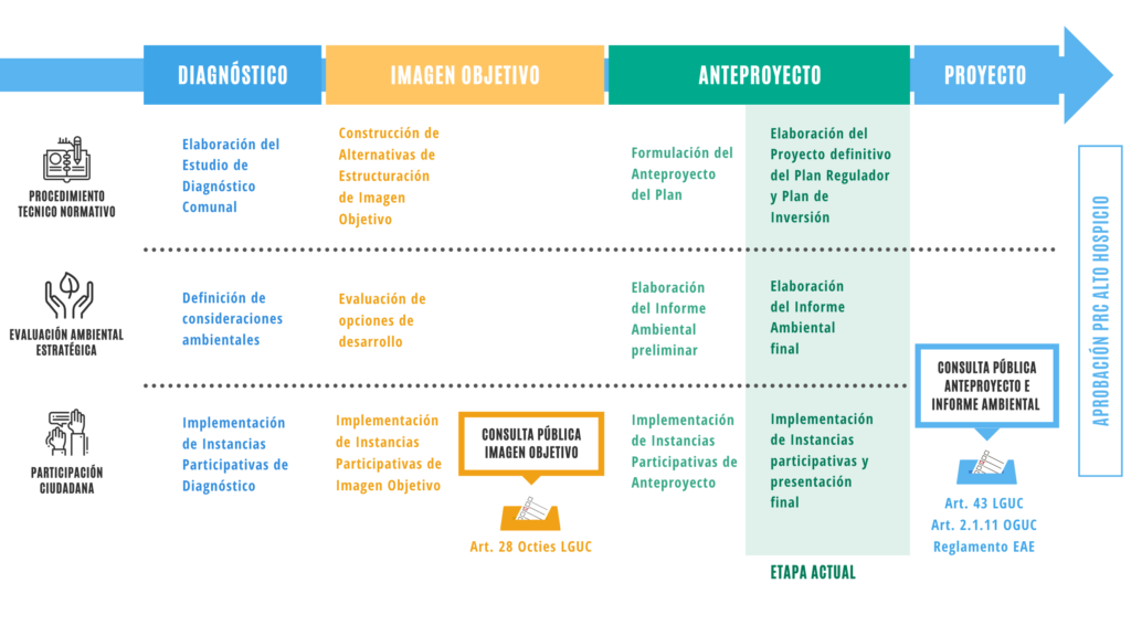 Actualmente nos encontramos en la etapa de Anteproyecto, en la cual se diseñan los componentes del plan (Memoria explicativa, ordenanza y planos), a partir de los acuerdos adoptados en la imagen objetivo e integrando las precisiones levantadas por la ciudadanía.